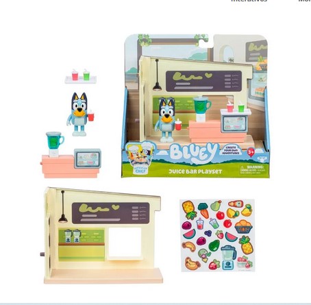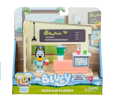 Com este cenário encantador, as crianças podem ajudar a Bluey a escolher seu suco favorito enquanto se divertem com acessórios superfofos como balcão, copos e um liquidificador.