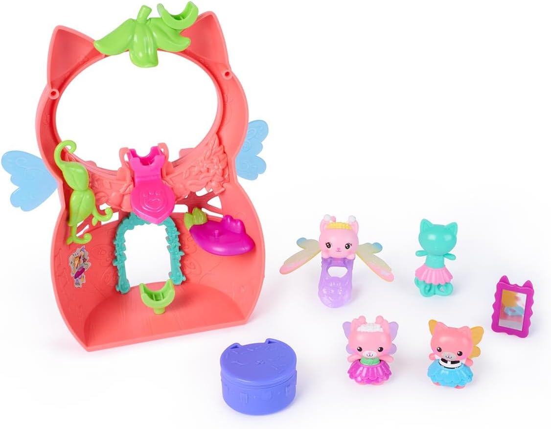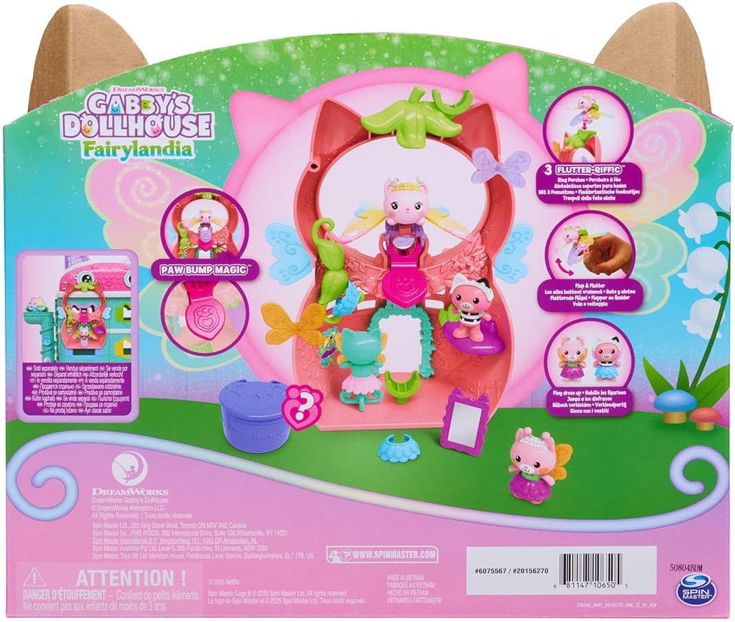 O Playset Kitty Fada traz toda a magia de Fairylandia da Gabbys Dollhouse diretamente para a brincadeira. Com 12 peças, incluindo figuras, acessorios, anões magicos para as fadas e asas articuladas que se movem como se estivessem batendo de verdade, o playset permite vestir, transformar e criar aventuras encantadas com Kitty Fairy e seus amigos. Posicionado junto a  Casa Mag¡ca da Gabby, ele amplia a diversões, possibilitando mundos de fantasia repletos de amizade, cores e encantos. Cada detalhe convida a imaginar portais magicos, encontros com novas fadas e momentos cheios de alegria e travessura.