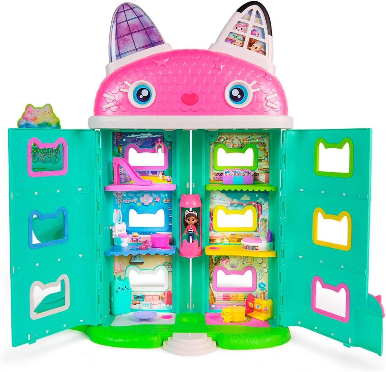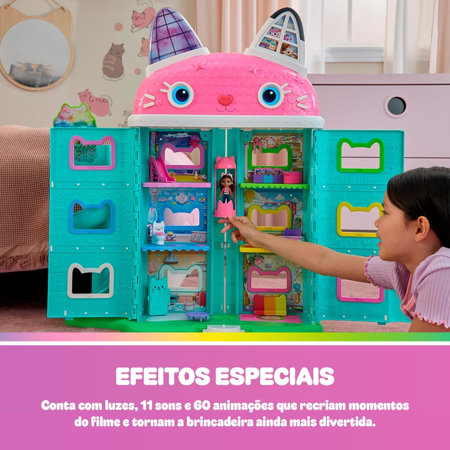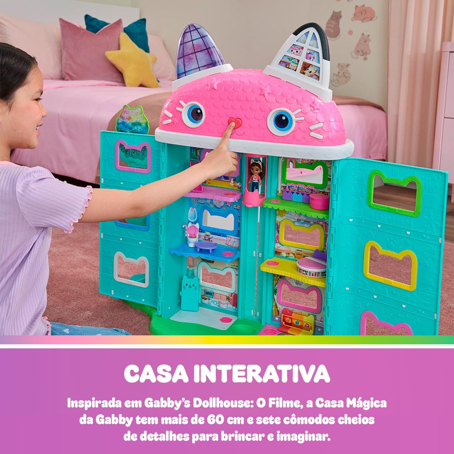 A Casa da Gabby do filme ganhou vida! Inspirada em Gabby’s Dollhouse: The Movie, essa casa interativa tem mais de 60 cm de altura, com sete cômodos cheios de surpresas, escorregador em espiral, elevador funcional, luzes, 11 sons e 60 animações.