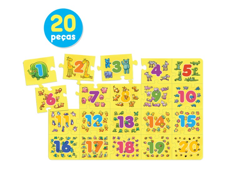 Brincando de montar este divertido quebra-cabeça, a criança aprende a contar e ordenar os números, associando as quantidades de bichinhos aos números.