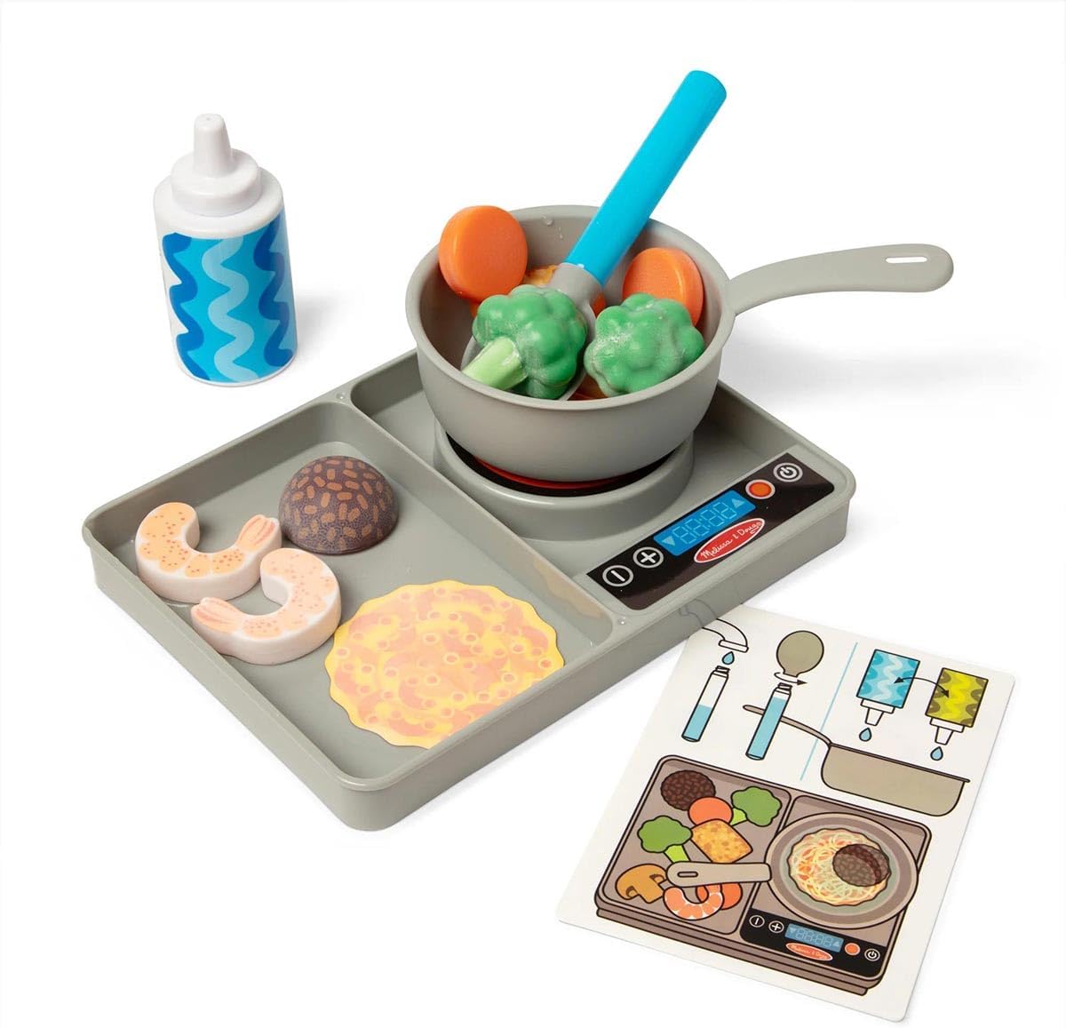 Acompanha fogão resistente, colher dosadora, garrafa de azeite, panela, seis vegetais e seis proteínas que mudam de cor, dois discos de refeição e um cartão de atividades reutilizável frente e verso.