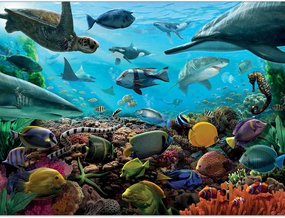 Quebra-cabeça de 1000 peças para você montar um rico ecossistema do fundo do mar. Este quebra-cabeça vem com padrão internacional de qualidade e encaixe suave que pode ser sentido em cada peça!