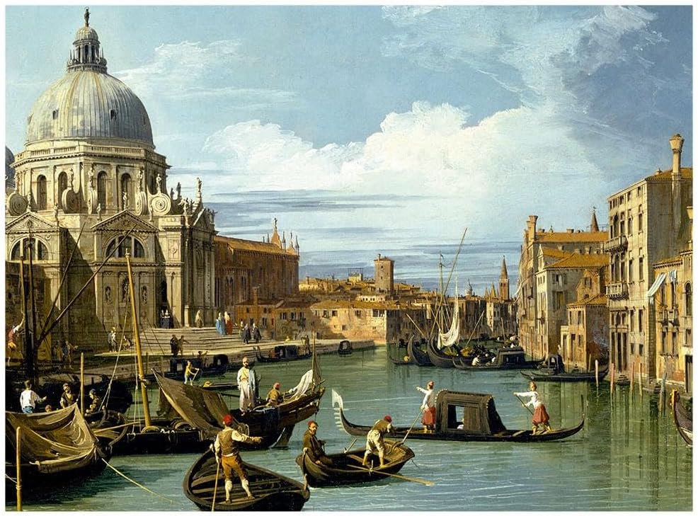 A imagem retrata a imponente Basílica de Santa Maria della Salute, as charmosas gôndolas e a atmosfera única da Veneza do século XVIII — tudo com a precisão e o realismo que tornaram Canaletto um nome eterno na história da arte.
