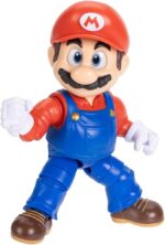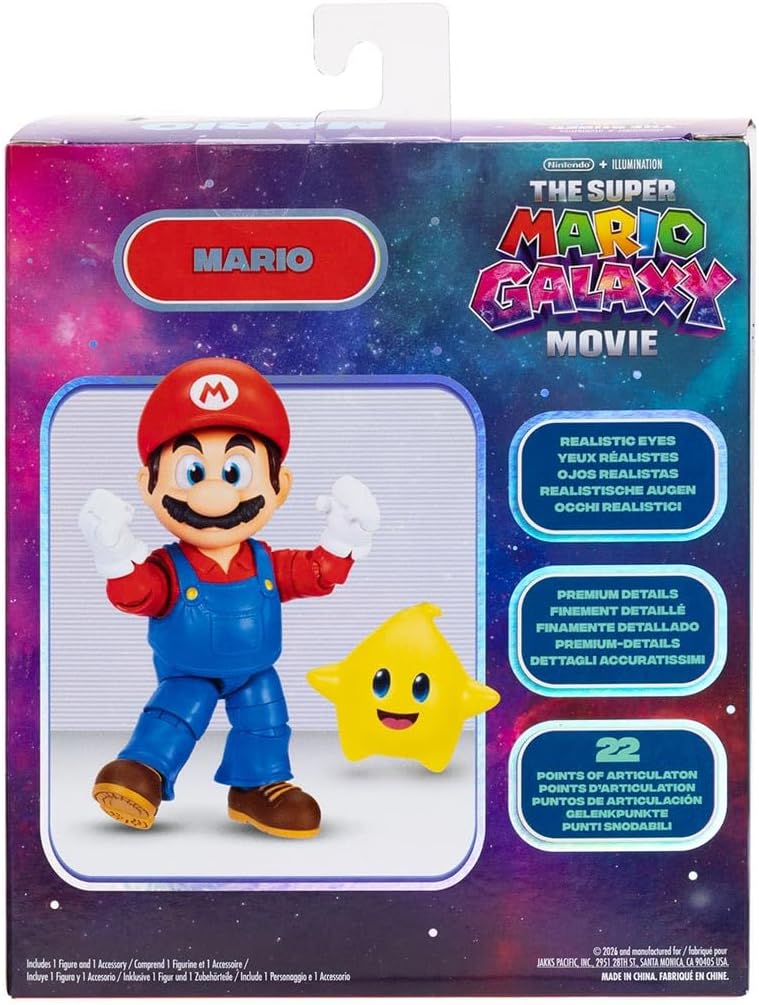 A figura do Mario é inspirada no filme e apresenta detalhes premium, incluindo olhos de acrílico realistas e 22 pontos de articulação. O Mario vem com um acessório Estrela Luma amarela que brilha no escuro, tudo apresentado em uma caixa com janela.